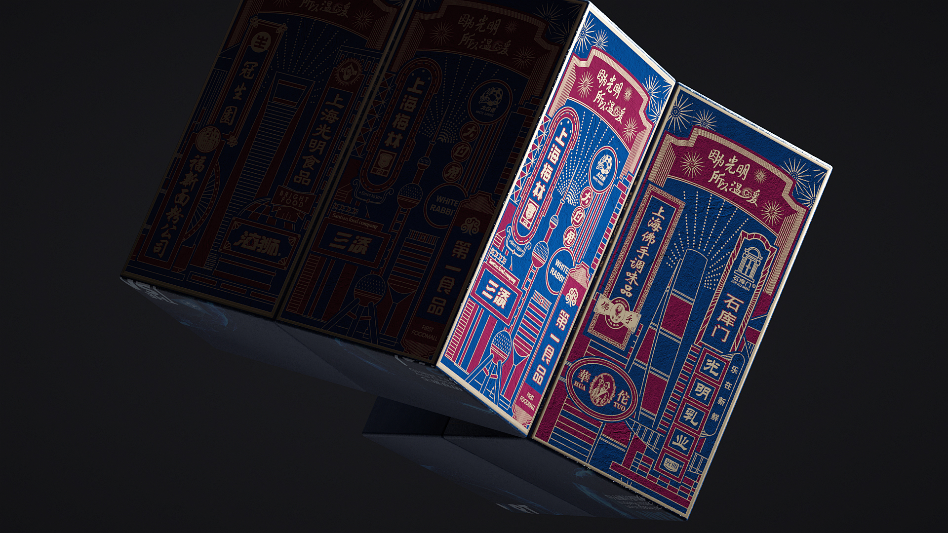 光明食品的老字號伴手禮盒設(shè)計,融入了光明集團(tuán)旗下現(xiàn)有的老字號品牌,結(jié)合悠久的海派文化底蘊,以新穎方式呈現(xiàn),展現(xiàn)“上海味道,上海腔調(diào)”。大膽而又不失復(fù)古的紅藍(lán),在形成強視覺沖擊的同時,凸顯著成熟穩(wěn)重的氣質(zhì)。