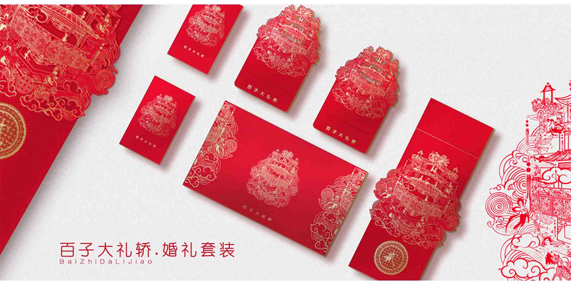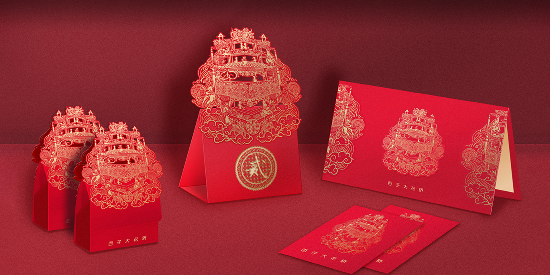 上海市歷史博物館館藏民國百子大禮轎是制作于上世紀(jì)三十年代的甬式大花轎,集多種非物質(zhì)文化遺產(chǎn)技藝于一身,工藝精湛,美輪美奐;同時它又是上海移民文化、民俗文化與海派文化融合的重要表征,實為館藏精品重器。當(dāng)木馬設(shè)計有幸看到花轎真顏的那一刻,便對它肅然起敬,更激發(fā)了為花轎做好喜事衍生品的愿望,將它的美融入人們的喜事生活?;ㄞI有"軟衣式"和"硬衣式"兩種。"軟衣式"是在轎框的四周罩以紅色的綾羅帷幕,硬衣式指花轎的全身都是木制結(jié)構(gòu),造型類似四方四角出檐的寶塔頂形。甬式花轎屬于該類型。該花轎制作采用圓雕、浮雕、貼金、涂銀、朱漆等裝飾手法,呈現(xiàn)數(shù)百個人物和花鳥蟲獸等吉祥圖案,配上彩繪的鏡片水銀玻璃和艷麗的金銀彩繡轎衣,朱金相間,光彩奪目,美輪美奐。